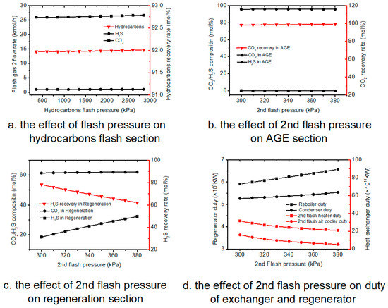 As shown in Figure 5a, with the increase of 1st flash pressure, the concentration of H2S and CO2 in sweet gas stabilizes at 0 and around 25 kmol·h−1, and hydrocarbons recovery rate is also stable at around 92%.