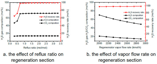 As shown in Figure 6a, increasing reflux ratio significantly increases the H2S composition in the H2S gas flow and H2S recovery rate. As the reflux ratio increased to a value of 0.8, the H2S recovery rate was approaching 100%, denoting that almost all the H2S moved to the gas phase; thus, further increasing the reflux ratio has a negligible effect on changing the H2S gas flow composition.