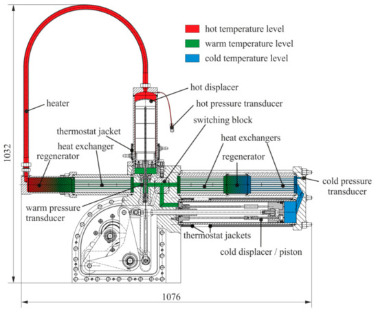 - Sauer, J.; Kühl, H.D. Numerical model for Stirling cycle machines including a differential simulation of the appendix gap. Appl. Therm. Eng. 2017, 111, 819–833. [Google Scholar] [CrossRef]
