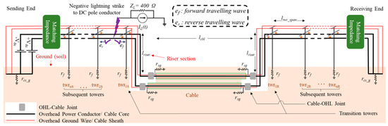 An equivalent circuit of a mixed HVDC transmission line for analysis of direct lightning strikes on overhead power conductors (OHPCs) at a negative pole (only the two towers closest to the sending end of the cable are shown) (description of symbols is provided in Table 1). [15].