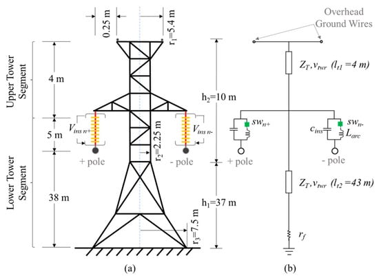 To emulate the overvoltage stress experienced by the insulators accurately, the vertical section of the tower is split into two sections connected at cross arms as shown in Figure 2b.