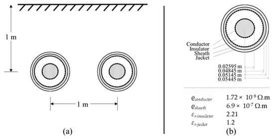Underground section of mixed HVDC transmission line (a) layout, (b) dimensions and electrical properties.