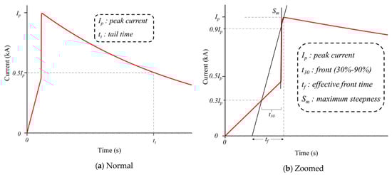 A lightning current waveform with an upwardly concave front, as shown in Figure 4, resembles closely the records of lightning current wave-shapes given in [27,33]. The mathematical representation of this waveshape can be seen in Equation (5):