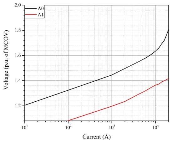 The nonlinear V-I characteristic of an arrester is represented using two nonlinear resistors A0 and A1, shown in the Figure 7. The nonlinear resistors are separated by an RL filter, which offers very low impedance to slow front surges, resulting in parallel conduction of the two resistors. However, for fast front surges the impedance of the RL section become quite significant. Therefore, more current is conducted by the nonlinear resistance ‘A0’. This results in a higher voltage across arrester terminals because the nonlinear resistor ‘A0’ has a higher voltage for a given current than the resistor ‘A1’, as can be seen in Figure 7. These V-I characteristics are obtained by modifying the characteristics proposed in [35] to match the V10 and VSS required in this study.