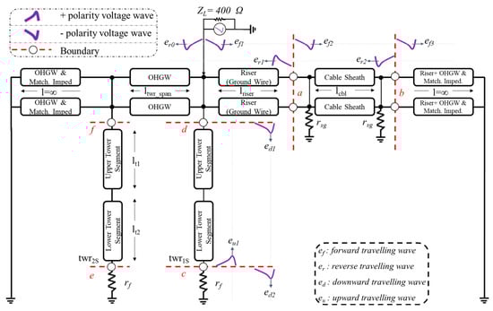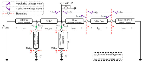 Negative lightning strikes are most likely to occur [27]. A negative lightning strike on a negative pole OHPC at twr1S will result in the constructive superposition of voltage, hence subjecting the cable to the highest overvoltages. The equivalent circuit is shown in Figure 8. Only two towers are represented in detail in this equivalent circuit. The OHPC can be seen to be isolated from the tower by an open switch. Therefore, a negative lightning strike on a negative OHPC can initiate a voltage surge ef1 travelling on the OHPC in the forward direction towards the cable and another voltage surge er0 traveling towards the DC source in the reverse direction as shown on the equivalent circuit in Figure 8. A portion of the wave ef2 is refracted inside the cable, whereas the rest, er1, is reflected backward at boundary a. The wave ef2 travelling forward inside the cable will be again reflected and refracted at the receiving end boundary ‘b’ of the cable. The magnitude of reflected and refracted waves can be determined by a traveling wave theory as per Equations (13)–(15).