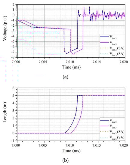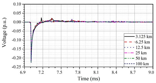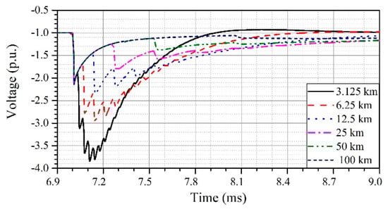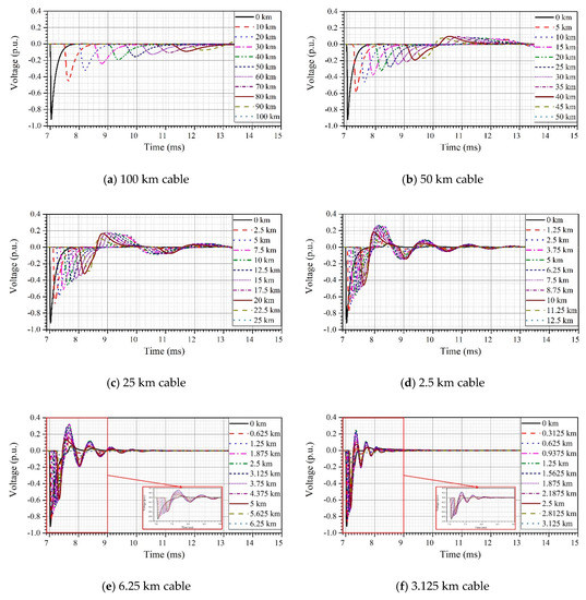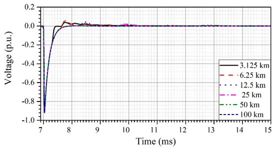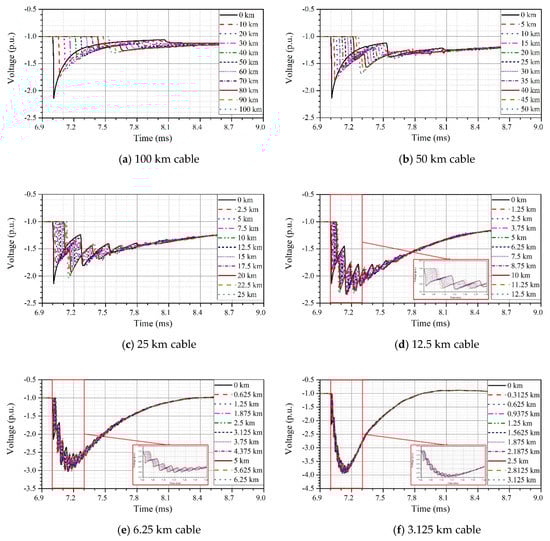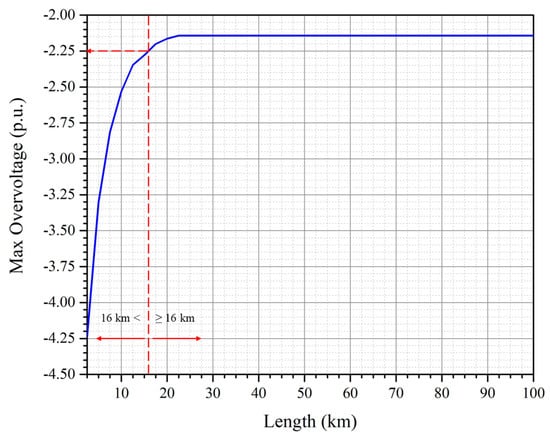The simulation results for the resulting overvoltage at the boundary ‘a’, i.e., the entrance of a cable according to cable length are shown in Figure 9.