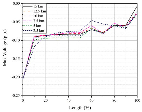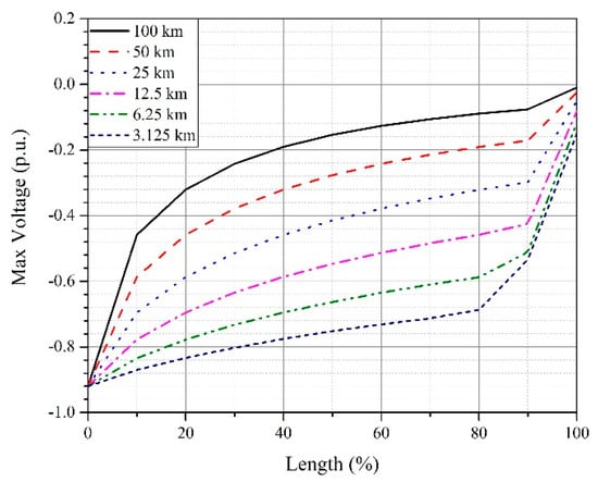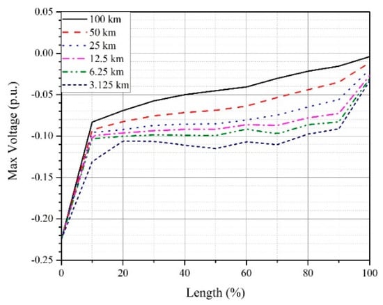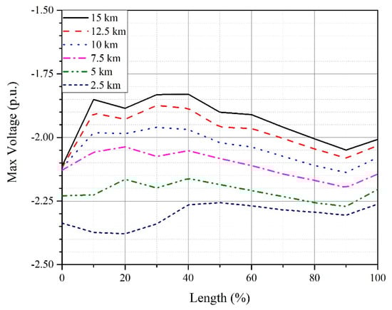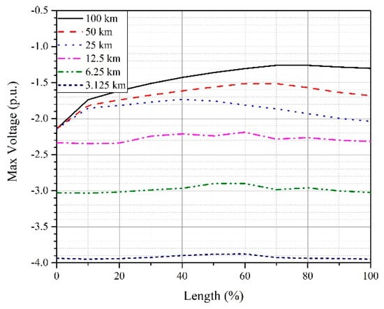 The direct lightning strike has been applied at the negative OHPC of the sending end transition tower. Cable lengths in the range of 2.5 km to 100 km (with an increment of 2.5 km) are considered. The transient voltage in each case is measured at ten equally spaced intervals along the length of the cable. The maximum overvoltage in each case is recorded and plotted according to the length of the cable as shown in Figure 20.