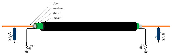 The stress on the insulation layers of the cable must be limited to acceptable levels to prevent the insulation failure under the influence of lightning strikes. If the CG overvoltage exceeds the desired LIPL the surge arrester should be installed at the terminals of the cable between the core and the ground, whereas if the SG voltage exceeds the desired LIPL of the jacket, the sheath grounding impedance must be lowered. The schematic of the surge arrester installed at the cable terminals is shown in Figure 19.