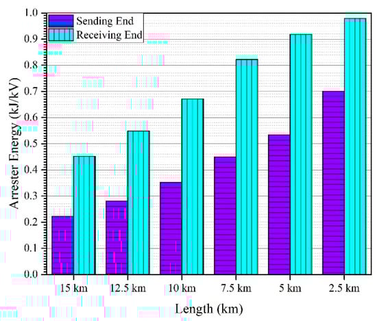 The energy dissipation in surge arresters installed at both ends of the line is shown in Figure 25. It can be seen that energy dissipation in the receiving end arrester is larger than the sending end regardless of the length of the cable. Moreover, energy dissipation becomes higher with the decrease in the length of the cable.