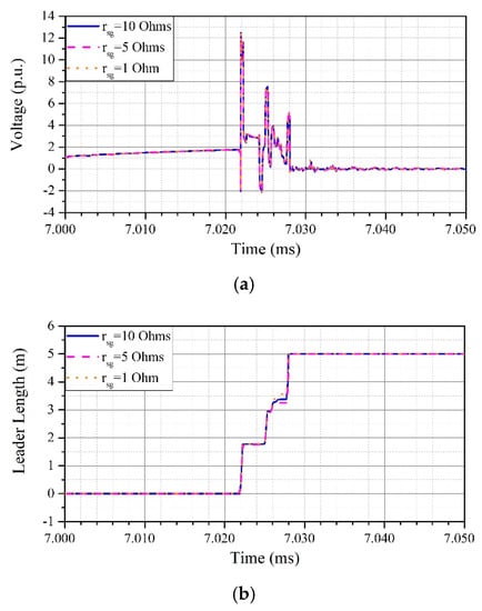 Lightning strike on the top of twr2S. (a) Voltage across positive pole insulators of twr2S according to sheath grounding impedance. (b) Leader growth between insulator gap of twr2S according to sheath grounding impedance.