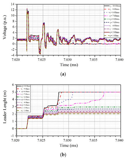 Lightning strike on the top of twr2S. (a) Voltage across insulators of the positive pole of twr2S according to footing impedance. (b) Leader propagation between the insulator gap of twr2S according to footing impedance.