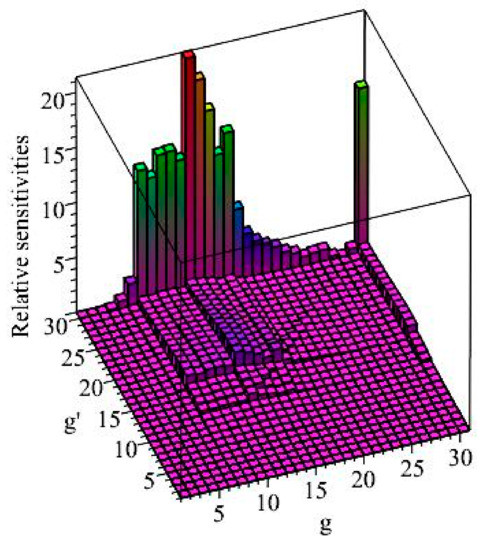Figure 2 depicts the results that were obtained for , , referring to 239Pu. This matrix is symmetrical, of course, with respect to its principal diagonal. As shown in this figure, 98 elements have relative sensitivities greater than 1.0, the majority (93 out of 98) of which are concentrated in the energy region that was confined by the energy groups and . Table 11 presents the actual numerical values of these elements. The largest value among these sensitivities is attained by the relative 2nd-order unmixed sensitivity of the leakage response with respect to the total cross section, , of 239Pu in energy group 12.