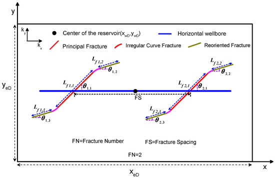 In this section, the physical model is introduced for pressure transient analysis of a horizontal well with multiple reorientation fractures in an anisotropic rectangular tight reservoir. Figure 1 presents the schematic of a horizontal well with two reorientation fractures, and every hydraulic fracture reoriented twice, which is significantly different from the physical model of Wu et al. [22]. Three parts, including principle fracture, irregular curve fracture and reoriented fracture, constitute the reorientation fracture. The basic assumptions are made as follows: