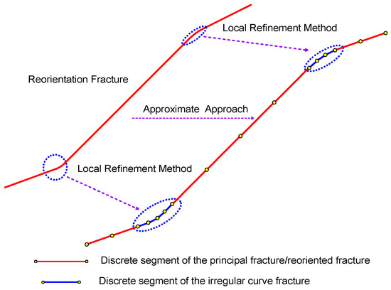 As stated previously, the reorientation fracture cannot be described by the ideal planar fracture. In order to stimulate the flow characteristics of a horizontal well intercepted by multiple reorientation fractures, we used the approximate approach similar to the boundary element method to handle the irregular shaped boundaries [23]. As illustrated in Figure 3, the irregular curve fracture is replaced by a series of planar fracture segments. Thus, the reorientation fracture system is considered to be composed of several planar fracture segments. The number of planar fracture segments used to describe the irregular curve fracture largely depends on the seepage of the irregular curve fracture.