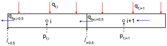 In this work, we assumed that the flow in the reorientation fracture is one-dimensional. Taking the i-th fracture segment as an example, we assume that the fluid flows from the (i+1)-th fracture segment to the i-th fracture segment (Figure 4). Based on the results of Zhou et al. [19], the pressure difference between the i-th fracture segment and (i+1)-th fracture segment can be written as: