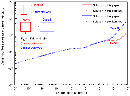 Comparison of pressure derivative for a horizontal well with three vertical fractures with the results of previous literature [8].