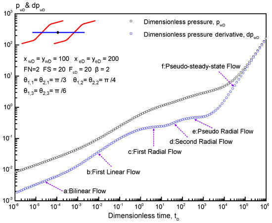 For a given set of parameters, the dimensionless pressure and its derivative of two reorientation fractures along the horizontal well in an anisotropic tight reservoir are displayed in Figure 6 to analyze its typical flow regimes. Figure 7 illustrates the fluid flow in the reservoir and reorientation fractures with different flow regimes. Without considering the transition flow regimes, we can easily observe six typical flow regimes in Figure 6: bilinear flow regime (BF), first linear flow regime (FLF), first radial flow regime (FRF), second radial flow regime (SRF), pseudo-radial flow regime (PRF), and pseudo-steady-state flow regime (PSSF).