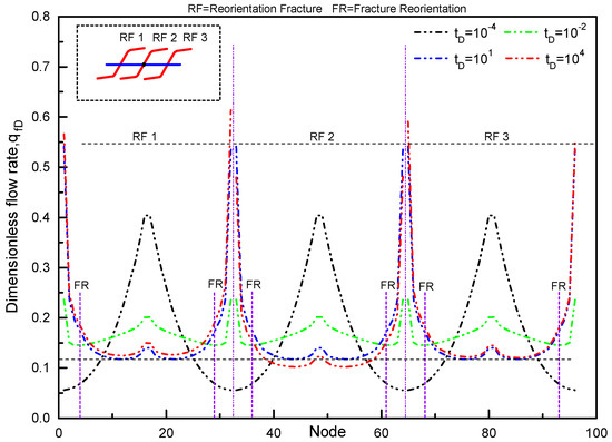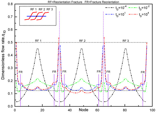 The production rate distribution of each reorientation fracture along the horizontal well in an isotropic tight reservoir is illustrated in Figure 8 when kx = ky. In the early flow regime (the black line in Figure 8), the production rate of each fracture segment is symmetrically distributed with respect to the wellbore node. As the pressure wave expands, the production rate in the reoriented fracture significantly increases along the extension of the reoriented fracture (the green line in Figure 8). For a long production time (Figure 8, tD = 104), the production rate distribution changes significantly. Since the outermost fractures (RF1 and RF3) have a larger drainage area, they have a higher production rate. In addition, owing to the flow interference, the inner fracture (RF2) has a lower production rate. Furthermore, the production rate distribution of the outermost fractures (RF1 and RF3) (the red line in Figure 8) is asymmetrical. The reoriented fractures away from the horizontal wellbore have a larger production rate due to the larger seepage area caused by fracture reorientation.