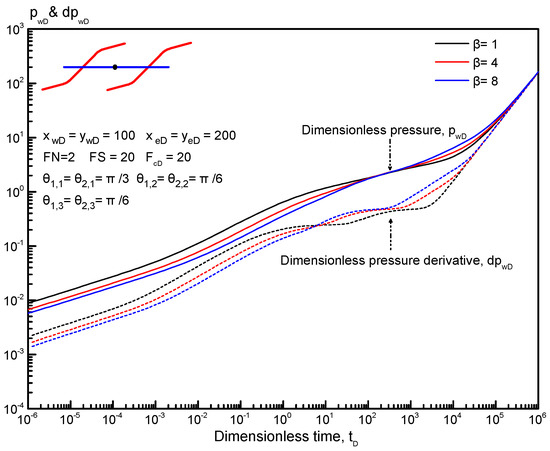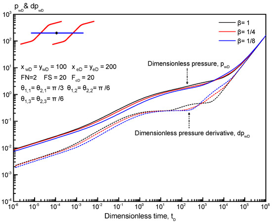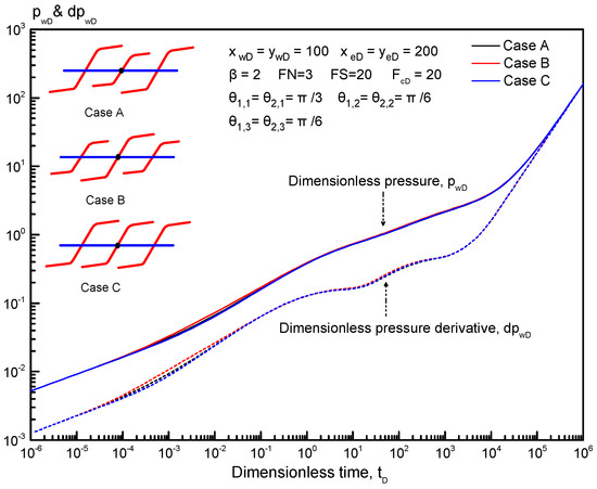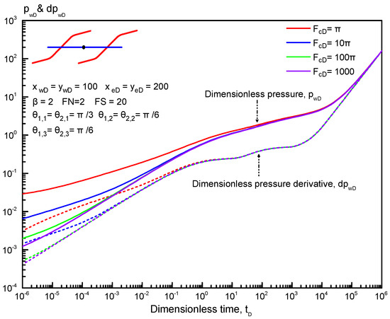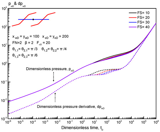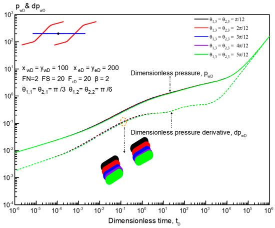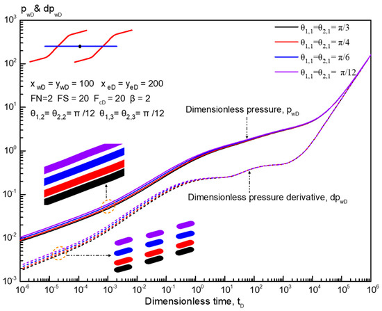 Figure 10 presents the effect of PFA on type curves for a horizontal well with two reorientation fractures. The dimensionless fracture spacing is set at 20. As displayed in Figure 10, PFA has a weak impact on type curves in the early-time period, i.e., the bilinear flow regime, first linear flow regime, and first radial flow regime. For an anisotropic tight reservoir, the dimensionless pressure and its derivative decrease as PFA increases, indicating that a large PFA is beneficial to improve the productivity of fractured horizontal wells. In addition, as PFA increases, the first radial flow regime occurs later. The effect of PFA on other flow regimes can be neglected.