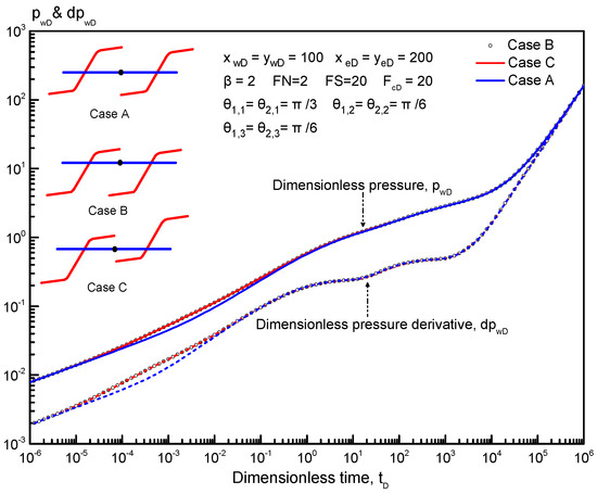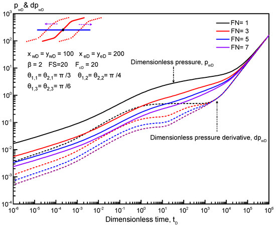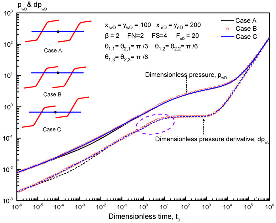 In this section, we analyze the sensitivity of the transient pressure of multiple reorientation fractures along a horizontal well in an anisotropic tight reservoir. We consider the case of a horizontal well with two reorientation fractures to analyze the effects of some key parameters, such as principal fracture angle (PFA), reoriented fracture angle (RFA), permeability anisotropic factor (PAF), and adjacent reorientation fractures spacing (FS), on the dimensionless pressure and its derivative curves. We also analyze the effect of reorientation fracture number and complex fracture configuration on type curves.