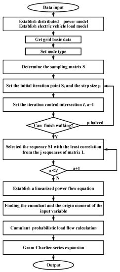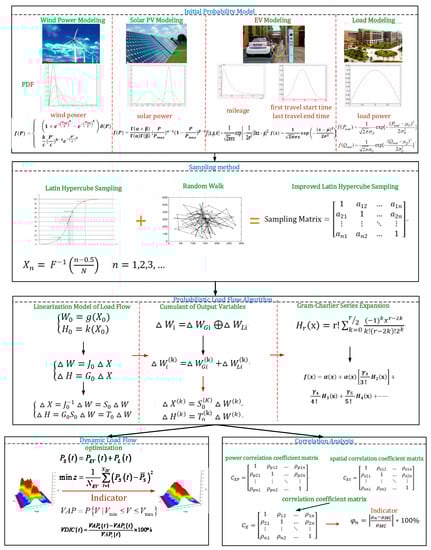 Analytical methods mainly include the convolution method and the Cumulant Method. The Convolution Method considers whether input variables have any linear correlation, and iteratively transform the relevant variables into a set of linear combinations of independent variables through a transformation. The probability distribution is fitted by calculating the output results. Though analytic theory of methods is generally simple and easy to understand, the calculation burden can be large. Allan et al. [] introduced the Laplace transform and fast Fourier transform to the convolution method, thereby effectively improving the computational efficiency. The cumulant is a numerical feature of random variables, which has additivity and homogeneity. When the inputs are independent and there is a linear relationship between the inputs and the outputs, the cumulant method [] is adopted instead of the convolution method to improve the computational efficiency. However, this method may limit the research object by specifying that it must have a fixed topology, or requiring the inputs to be independent. Work in [] proposed a PLF algorithm based on a combination of Monte Carlo Sampling (MCS) and the cumulant method. However, the MCS requires a large number of samples to make the results accurate. Paper [] considers that connection of electric vehicles to distribution networks, but using probabilistic Monte Carlo method alone, it is inefficient. Paper [] further proposed an algorithm based on the Latin hypercube sampling. This method combined Cholesky decomposition to deal with the correlation of input variables, and introduced a piecewise linearized load flow model to improve accuracy. However, Cholesky decomposition is only suitable for positive definite matrices.