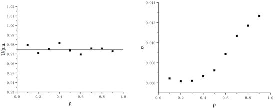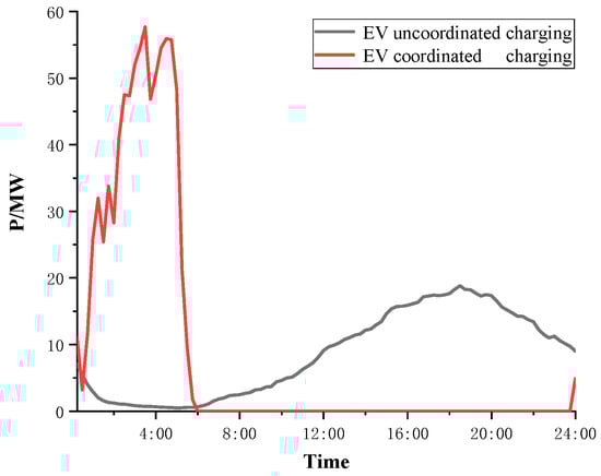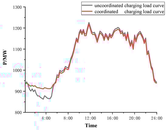 In this paper, the dynamic probabilistic characteristics of the node voltage amplitude are analyzed, with consideration of uncoordinated and coordinated charging []. In the case of uncoordinated charging, the owner is accustomed to charge the EV immediately after the last trip. Coordinated charging means the use of practical and effective economic or technical measures to guide and control EV charging while meeting the charging requirements of EVs. This paper focuses on load leveling [,]. The EV coordinated charging and uncoordinated charging curves are shown in Figure 11. The total load curves with EV coordinated and uncoordinated charging are shown in Figure 12.