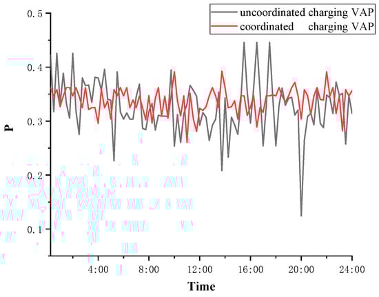 The upper and lower limits of the allowed voltage are −7% and 7%, and the VAP for coordinated charging and uncoordinated charging are calculated according to the data in Figure 12 and Figure 13, as shown in Figure 15. The VDIC index of Node 21 is shown in Table 7. It can be seen that with coordinated charging optimization, the voltage at Node 21 achieves stable probability fluctuation, which also reduces the risk of the electrical energy network.