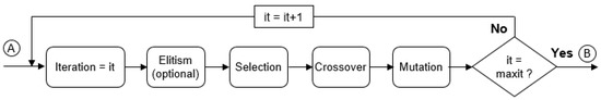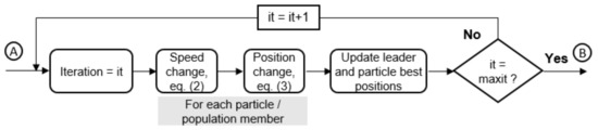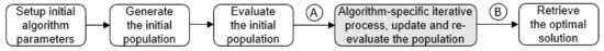 Metaheuristics are a special class of algorithms that can be used to solve search and optimization problems. As described in [34], they are approximate, usually non-deterministic methods that aim to search for solutions near the global optimum, exploring this space through a partly guided and partly random search. While the main disadvantage of metaheuristics is the uncertainty of reaching the global optimal solution, their advantages lie in not being problem-specific (allowing the flexibility of applying the same solving principle to several types of problems) and having intuitive mathematical models, borrowing concepts and approaches from the natural world, rather than from theoretical mathematical models. This contributes to their accessibility for a wider range of users. Most modern metaheuristics are population-based, starting from an initial group of solutions, called ‘population’, generated randomly, and refining it in an iterative process, according to a set of specific steps, until a stopping criterion is met. The performance of each individual from the population is assessed by computing its fitness function. The basic block diagram of a population-based metaheuristic algorithm (PMA) is depicted in Figure 1, where the steps common to all algorithms are represented with white boxes, and the part specific to each algorithm, delimited by symbols (A) and (B) is presented in gray.