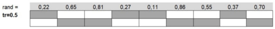 The method of choice for the crossover operator was the uniform crossover, illustrated in Figure 3. Two parents are randomly chosen from the population and, for each gene, a random number is generated. The parents swap the genes only if the generated random number exceeds a customizable threshold tr.