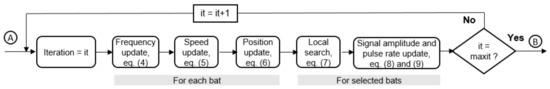The bat optimization algorithm [41] uses the PSO principle of changing the speed and position of the population members (here called ‘bats’), but the speed update formula is more elaborated, considering the principle of raising the signal frequency and pulse rate as the bats are getting close to the prey, i.e., to the optimal solution. The basic flowchart of a BOA iteration is depicted in Figure 5.