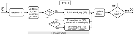 The WOA uses a population of vector solutions (‘whales’), which are hunting for prey independently, guiding their search by following a reference individual, usually their leader, i.e., the whale closest to the problem solution (‘food’), according to its fitness function.