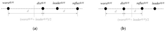The newly computed individual reflex(g,it) will replace worst(g,it) only if its fitness function is better. At the beginning of the iterative process, when the inertia w from Equation (16) is large, the individual will search beyond leader(g,it) (exploration phase, Figure 7a). As w decreases, the search will focus between worst(g,it) and leader(g,it), exploiting the search space around the known optimal solution (Figure 7b).