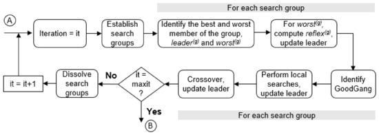 At the end of the iteration, the groups are reunited in the final population, which will repeat the search process until the stopping criterion of the algorithm is met. The basic flowchart of a SWA iteration is presented in Figure 8.