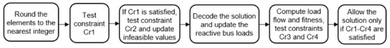 All the algorithms tested in the case study used the same solution encoding for their population members. They were generated as vectors of the type described by Equation (1), with integer numbers and length equal to the number of buses in which compensation was possible in the network. The significance of the value of a generic element represented the number of CBs placed in the bus to which it was designated. All the algorithms started in the first iteration with the same population, generated randomly but considering constraint Cr2 of maximum allowed number of CBs in each bus and Cr1, the maximum CB stock (Figure 9).