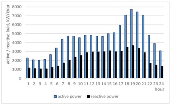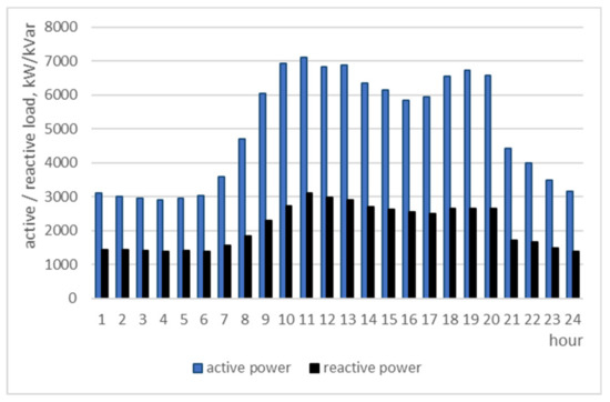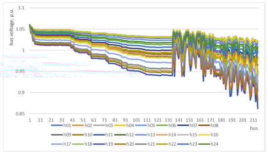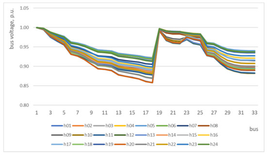 In Equations (19) to (22), ΔP[%] is the percent active power loss in the EDN over 24 h, ΔPh is the active power loss in the EDN at hour h, NCBbus is the number of CBs installed in a generic bus; qCB is the reactive power rating of a CB, Qbus is the reactive load of a generic bus, stockCB is the CB stock; Ibr is the current flow on a generic branch br, Imax,br is the rated current of branch br, Ubus is the voltage of a generic bus after compensation, and Umax,bus is the maximum bus voltage allowed in a generic bus.
