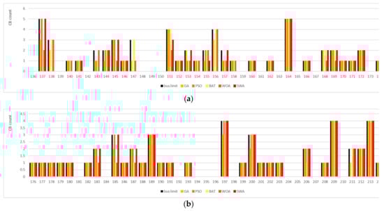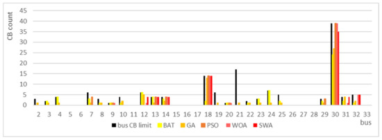 A brief description of the papers that use metaheuristics in the CBA problem considering both objective functions (OF) and constraints (C) is presented in Table 1. The considered objective functions are: OF1, active power losses minimization; OF2, voltage profile improvement; OF3, voltage deviation minimization; OF4, cost minimization; OF5—net savings maximization; OF6, voltage stability improvement. The main constraints for the OCBA problem are a combination of the following: C1, bus voltage allowable limits; C2, current flow limits on the branches; C3, bus reactive allowable limits; C4, maximum stock of capacitors; C5, bus apparent power balance; C6, maximum number of transformer tap changer steps; C7, the total reactive power injected should not exceed the total reactive power demand; C8, power flow limits on the branches; and C9, bus power factor limits.