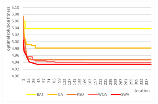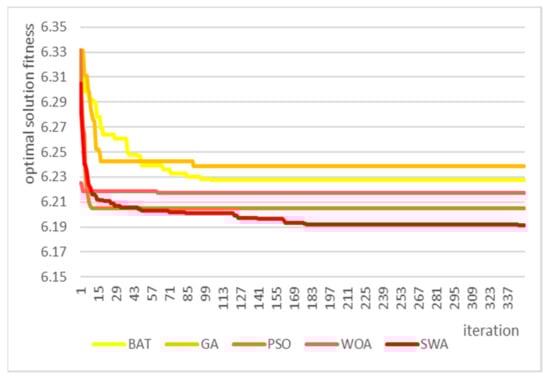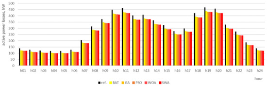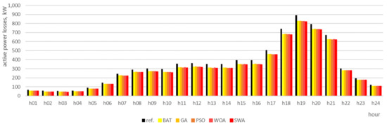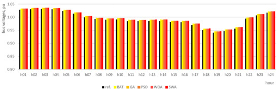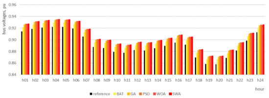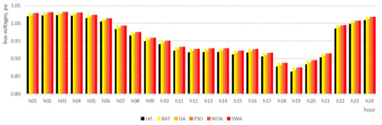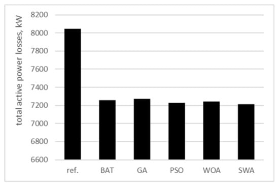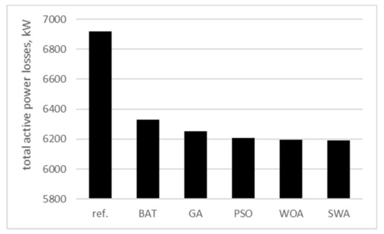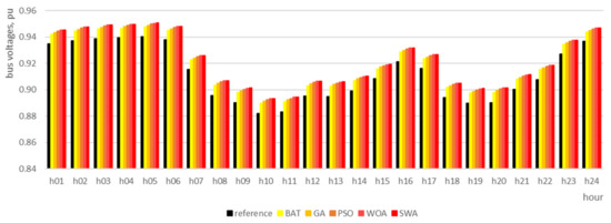 Among the various metaheuristic algorithms available in the literature, those from Table 2 were chosen taking into account the following reasoning: the genetic algorithm and the particle swarm optimization are the best known and widely used metaheuristics, with numerous applications in power systems, which makes them a valid basis for comparison. The bat algorithm and the whale optimization algorithm are newer algorithms, previously used by the authors in solving similar optimization problems and shown to improve the quality of the results, compared with GA and PSO [35,36]. On the other hand, the sperm whale algorithm is a novelty in solving optimization problems in the power systems field. The results from the case study will show that the SWA outperforms the previous algorithms, making it a viable new alternative for solving optimization problems related to power systems applications.