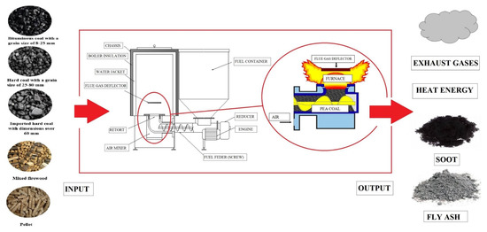 The tests were carried out by burning the following fuels: hard coal with a size of over 60 mm, hard coal with a grain size of 25–80 mm, hard coal with a granulation of 8–25 mm, pellets with a grain size of 6 mm and mixed firewood. The combustion process was carried out on a laboratory bench [22] (Figure 1) consisting of Moderator Unica Vento Eko boiler 25 kW with an automatic feeder equipped with a manual and retort grate. The temperature of the feed water (at the boiler’s outlet) was about 70–80 °C, while at the return it was not less than 50 °C.