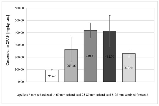 - Among the examined soot samples from the combustion of solid fuels, the lowest PAH concentration was obtained in soot samples from combustion of 6-mm pellets (95.62 ± 6.44 mg/kg DM), and the highest was obtained for 25–80 mm coal (418.21 ± 61.03 mg/kg DM), which was over 4 times higher than in the case of 6-mm pellets.