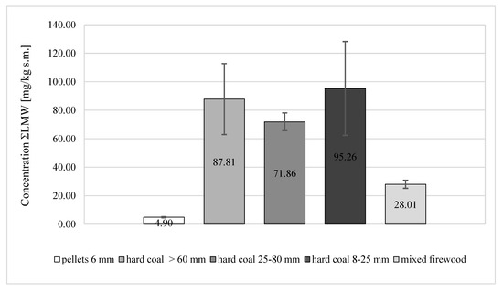 When analyzing the compactness of light PAH fraction, determined with the abbreviation LMW (Figure 3) and containing hydrocarbons consisting of two and three aromatic rings, it was found that soot from the combustion of pellets and mixed fuel wood contains, as in the case of a total of 16 PAH, the least LMW; these values were 4.90 ± 0.42 mg/kg DM and 18.01 ± 2.81 mg/kg DM, respectively. These values represented only 5% of the total PAH content for pellets and 12% for firewood. The content of ΣLMW in soot samples from hard coal combustion was much higher than in the case of pellets and firewood. The highest content of ΣLMW was obtained in soot samples from the combustion of coal with 8–25 mm granulation and it amounted to 95.26 ± 32.92 mg/kg DM, which constituted 23% of the total PAH content. However, in the samples after combustion of coal with a granulation of 25–80 mm and coal with a granulation above 60 mm, the ΣLMW contents were 71.86 ± 6.24 mg/kg DM and 87.81 ± 24.89 mg/kg DM, respectively. These contents for coal of 25–80 mm granulation and coal of >60 mm granulation constituted 17% and 33% of their total PAH content, respectively.