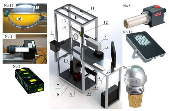 Scheme of experimental setup: 1—high-speed video camera (depending on the objectives, one or two cameras were used); 2—Nd:YAG pulse laser; 3—synchronizer; 4—personal computer; 5—air heater and compressor; 6—metal cylinder (into which a combustible liquid was supplied to produce a flow of heated flue gases); 7—flue gases supply duct; 8—heated air flow supply duct; 9—sliding valve (for isolated supply of flue gases and heated air); 10—reservoir with water; 11—atomizer; 12—light system; 13—cylinder made of heat-resistant quartz glass; 14 – disk element for nozzle installation; 15—liquid supply capillaries; 16—nozzles.