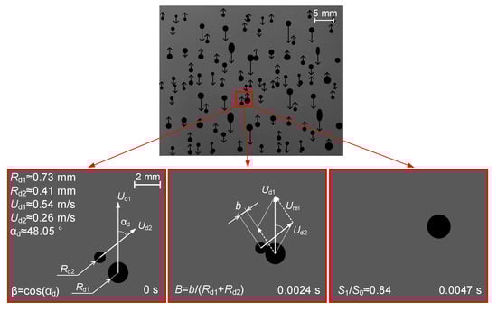 (iii) We analyzed the motion patterns and velocities of droplets after their collision. If the direction and velocity remained the same after the collision, the case was excluded. If the droplets changed their direction/velocity or if the droplets coalesced and only one droplet and its motion pattern could be identified after the collision, the cases were processed and analyzed.