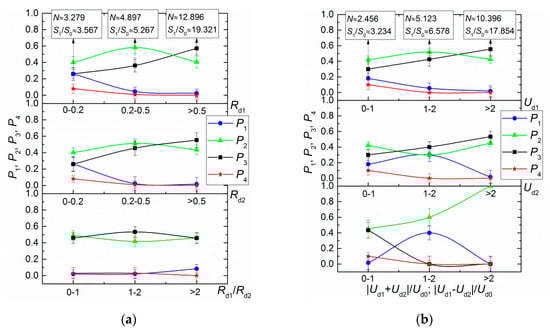 Frequency of each of four droplet interaction modes (P1—coalescence, P2—separation, P3—disruption, P4—bounce) when sizes and their ratios were varied (a), when velocities and relative velocity were varied (b).