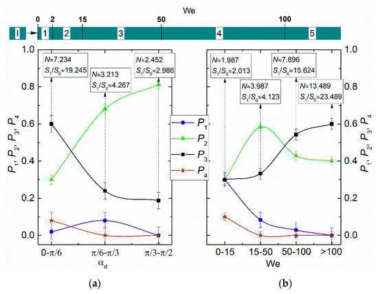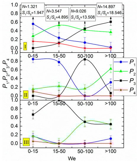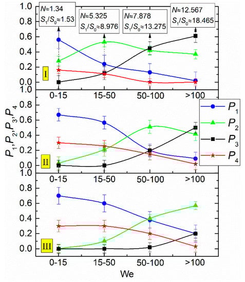 Frequency of each of four droplet interaction modes (P1—coalescence, P2—separation, P3—disruption, P4—bounce) when varying impact angle (between flight trajectories) (a) and Weber number (b). Additional experimental data (I) is presented on recording different droplet collision modes at 0 < We < 200 [,]: 1—bounce; 2—stable coalescence; 3—coalescence with following separation; 4—separation; 5—disruption).