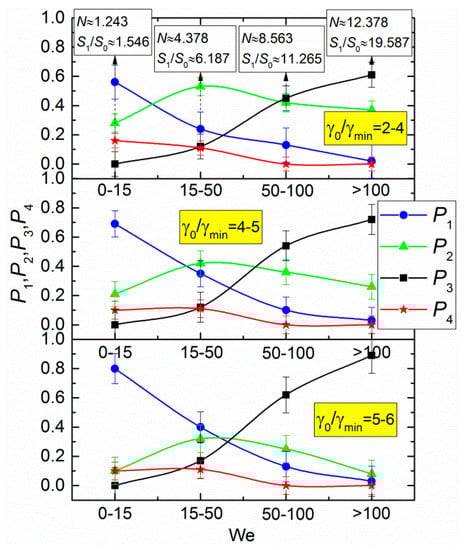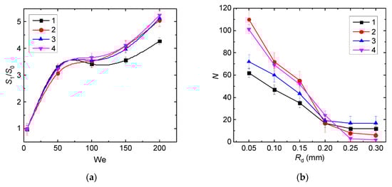 - Ratios of initial surface areas of interacting droplets and their roles: target or projectile. The results of processing the experimental data on liquid droplet interaction are often generalized with no emphasis on the droplet role. The experiments [,] have shown that pre-collision projectiles and targets can differ not only in size and velocity but also in shape. This factor should be taken into account when data is generalized, and especially when the outcomes of droplet collision are analyzed. It makes sense to determine the average number of new droplets N and the ratio S1/S0.