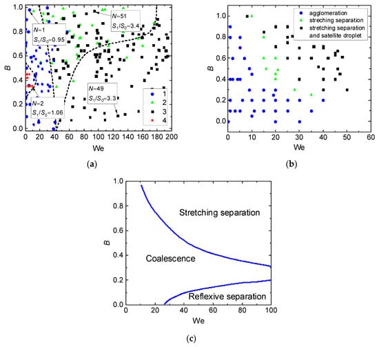 The parameters of the gaseous medium have a significant effect on the regimes of collisions of liquid droplets [,], since the ratios of inertial forces, viscosity, and surface tension change. In the present work, the air was used as a gaseous medium. The properties of air (for example, viscosity and density) within the varied ranges did not change significantly. Therefore, in this work, this factor could be neglected. In other environments, for example, in a gas-vapor mixture based on combustion products, droplets and vapor of liquids, the density, viscosity, and component composition of the gas mixture can have a significant effect on the modes of collisions.