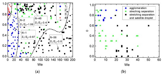 When generalizing the experimental data for droplet collisions, we established some important consistent patterns: the transition to the breakup (which contributes to a severalfold growth of S1/S0) is possible even at high surface tension and viscosity of the liquid. In line with the known concepts [,] of surface transformations of different liquid droplets in the field of the main forces, a rapid breakup is unavoidable at low viscosity and surface tension of the liquids. Under such conditions, the molecular forces, resulting from tension and internal friction, are weak. The experiments without collisions showed that the velocity of droplets under 5 m/s and their radii ranging from 1 to 3 mm are sufficient for their significant transformation and breakup with the formation of numerous fragments. In the case of droplet collisions, we found out that the interacting slurry droplets are characterized by minimal critical Weber numbers, which are enough for droplets to break up, despite the maximum values of surface tension and viscosity. When water is heated to 60–80 °C, viscosity and surface tension are, on the contrary, several times lower, whereas the critical Weber numbers are higher than for suspensions. This is explained by different modes of droplet collisions and the formation of differently-shaped structures in the interaction. To consider these specific features, we can use the obtained interaction regime maps (Figure 10 and Figure 11) in dimensionless We(Oh), Re(Oh), and We(Ca) coordinate systems.