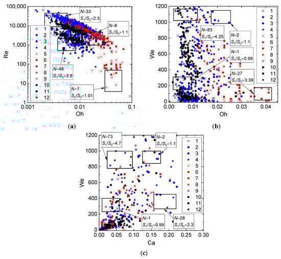 Interaction regime maps ((a)—Re = f(Oh); (b)—We = f(Oh); (c)—We = f(Ca)) considering inertia, friction, surface tension, and viscosity for three water slurries under study: water at 20 °C (1—coalescence, 2—bounce, 3—separation, 4—disruption); water at 80 °C (5—coalescence, 6—bounce, 7—separation, 8—disruption); graphite slurry (9—coalescence, 10—bounce, 11—separation, 12—disruption).