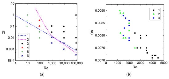 Interaction regime maps considering inertia, friction, surface tension, and viscosity in accordance with the data: (a) []: 1, 2—the dashed blue and purple lines are extensions of the expressions over the phase diagram (for interpretation of the references to color in this figure legend, the reader is referred to the web version of this article); 3, 4—moreover, in the splashing regime, red dots correspond to impact with the appearance of a lifted thin film and black dots to impact creating satellite droplets; 5—each type of marker represents a different behavior of the droplet; 6—asterisks stand for the deposition impact, dots for a splashing impact, and crosses for an impact with the appearance of a gas cushion during the transition period; (b,c) generalization of the experimental results []: 1—coalescence; 2—separation; 3—disruption.
