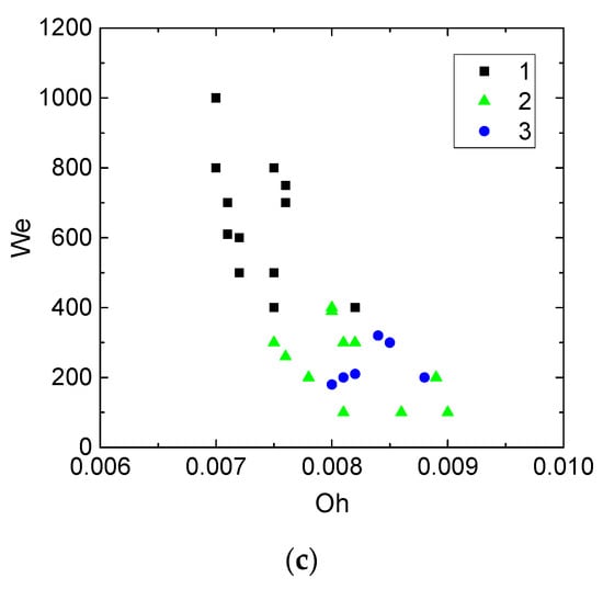 In the Re(Oh) and We(Oh) charts, we can evaluate the contribution of inertia, viscosity, and surface tension when defining any given droplet interaction mode. In the We(Ca) chart, we can evaluate the contribution of inertia, friction, and surface tension. The analysis of Figure 10 and Figure 11 shows that the liquids under study have a considerable difference in the ratio of these forces when varying the key experimental parameters discussed above and when comparing the experimental results for water at room temperature and high temperatures, as well as for slurries (the difference is especially noticeable in viscosity, density, and surface tension).